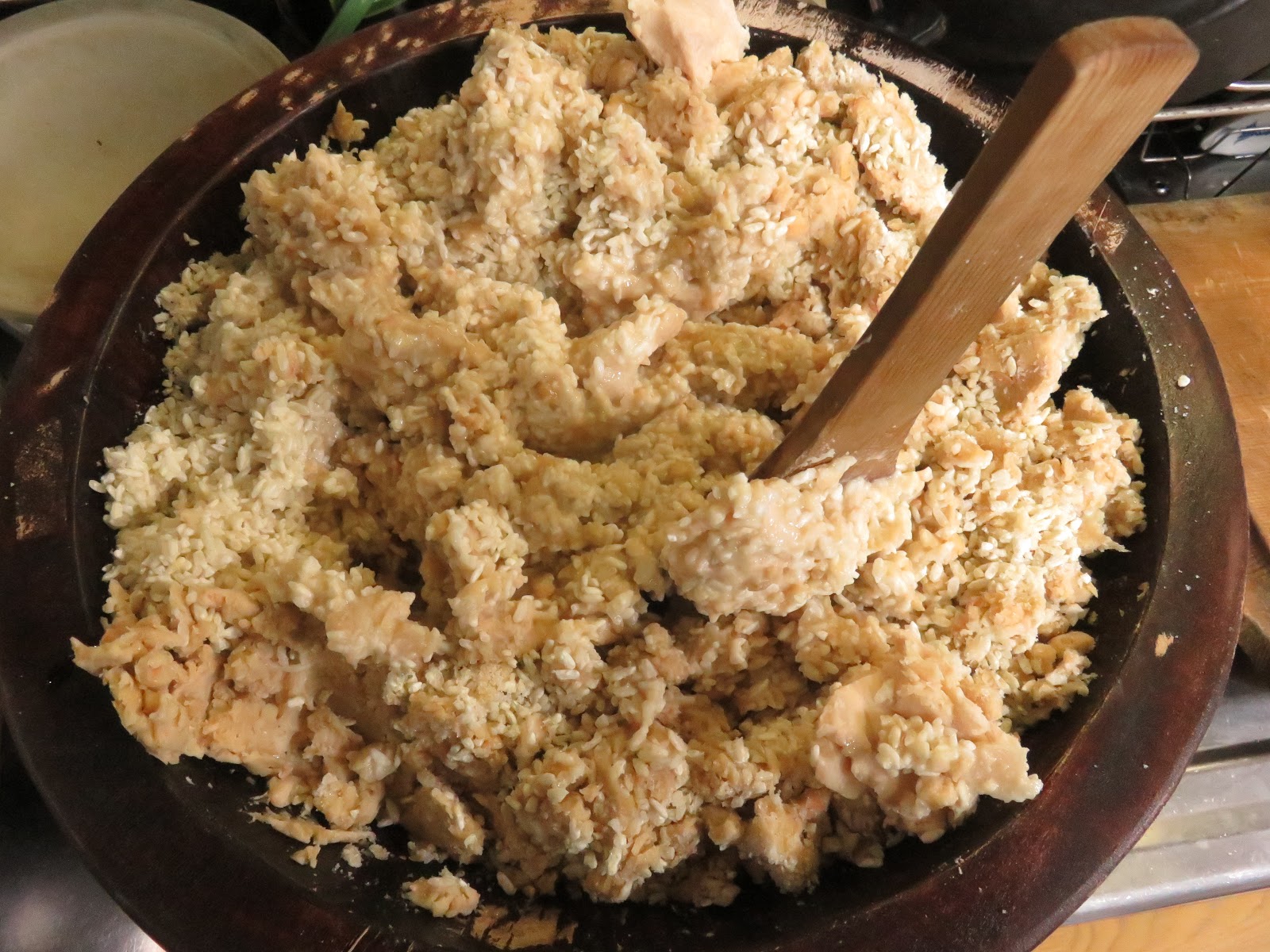 塩切した麹と酒粕300gと天然水0.8ℓで粘度調整してよく混ぜる。